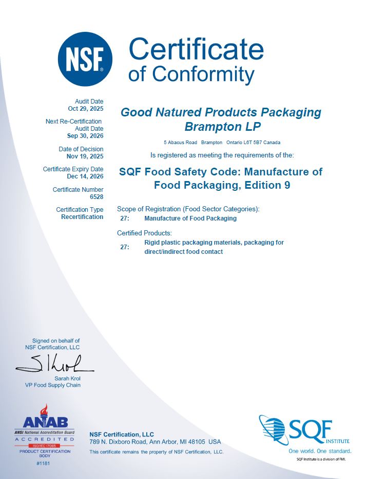 At our plant-based paradise (aka facilities), we’re all about producing top-notch products and packaging. In fact, our facilities are so spotless, you could eat off the floor (although we don’t recommend it)! We’ve got the credentials to prove it - because nothing says “quality” like a planet-friendly stack of digital paperwork. SQF Food Safety Certified.