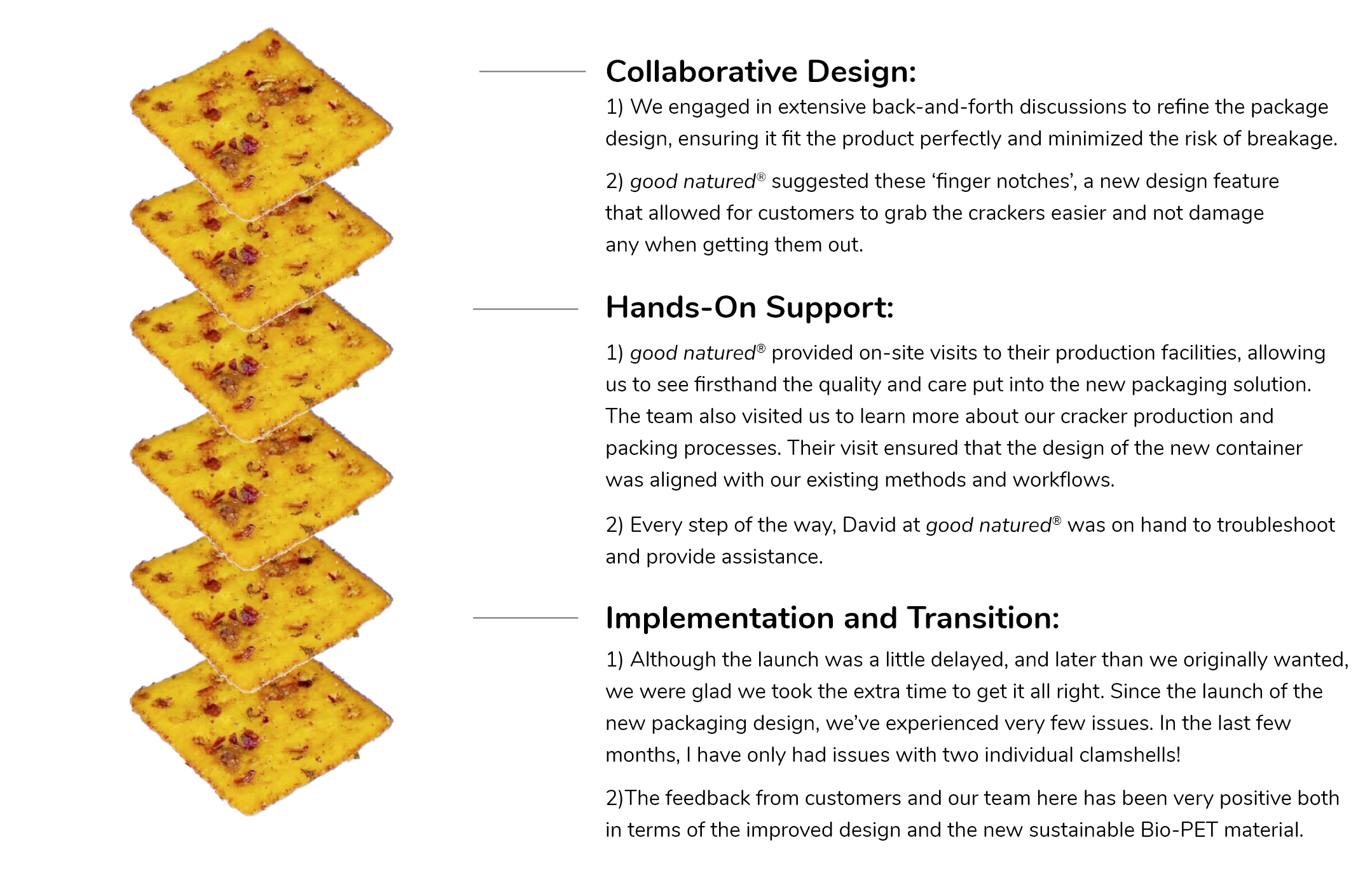 The newly designed packaging not only minimized cracker breakage, but it also streamlined the packing process. The improved design allowed for faster and more accurate packing, reducing labor time and boosting overall production efficiency.